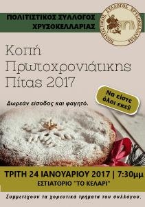 Σήμερα, στο εστιατόριο «Το Κελάρι» και ώρα 7:30μ.μ. σας περιμένουμε όλους για την κοπή της Πρωτοχρονιάτικης πίτας!!!